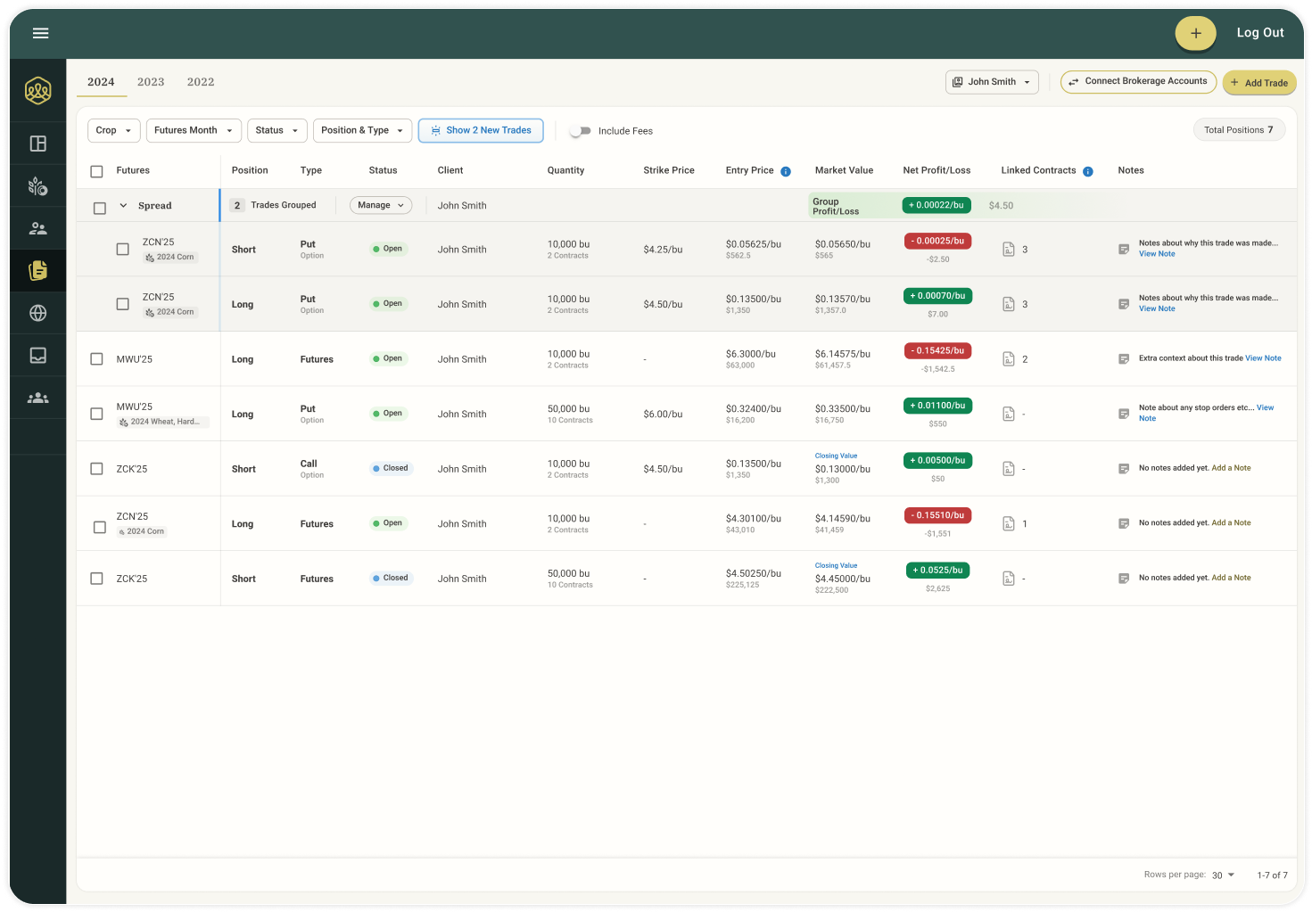 Copilot’s Brokerage feature is built for advisors who need a reliable way to manage board positions, organize hedging strategies, and map paper trades to physical bushels—without the manual headaches. While Copilot doesn’t execute trades, it empowers you with a real-time record of how your clients’ grain is protected and where exposure remains.